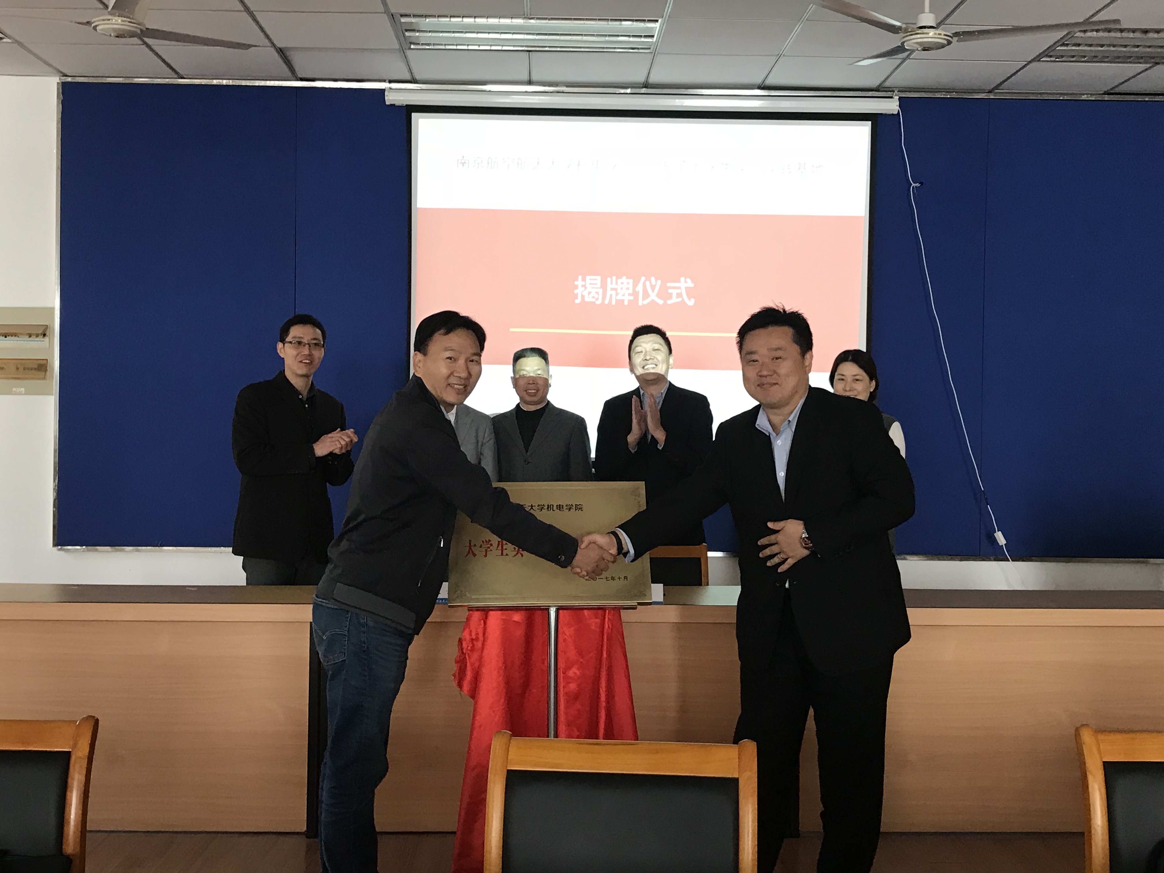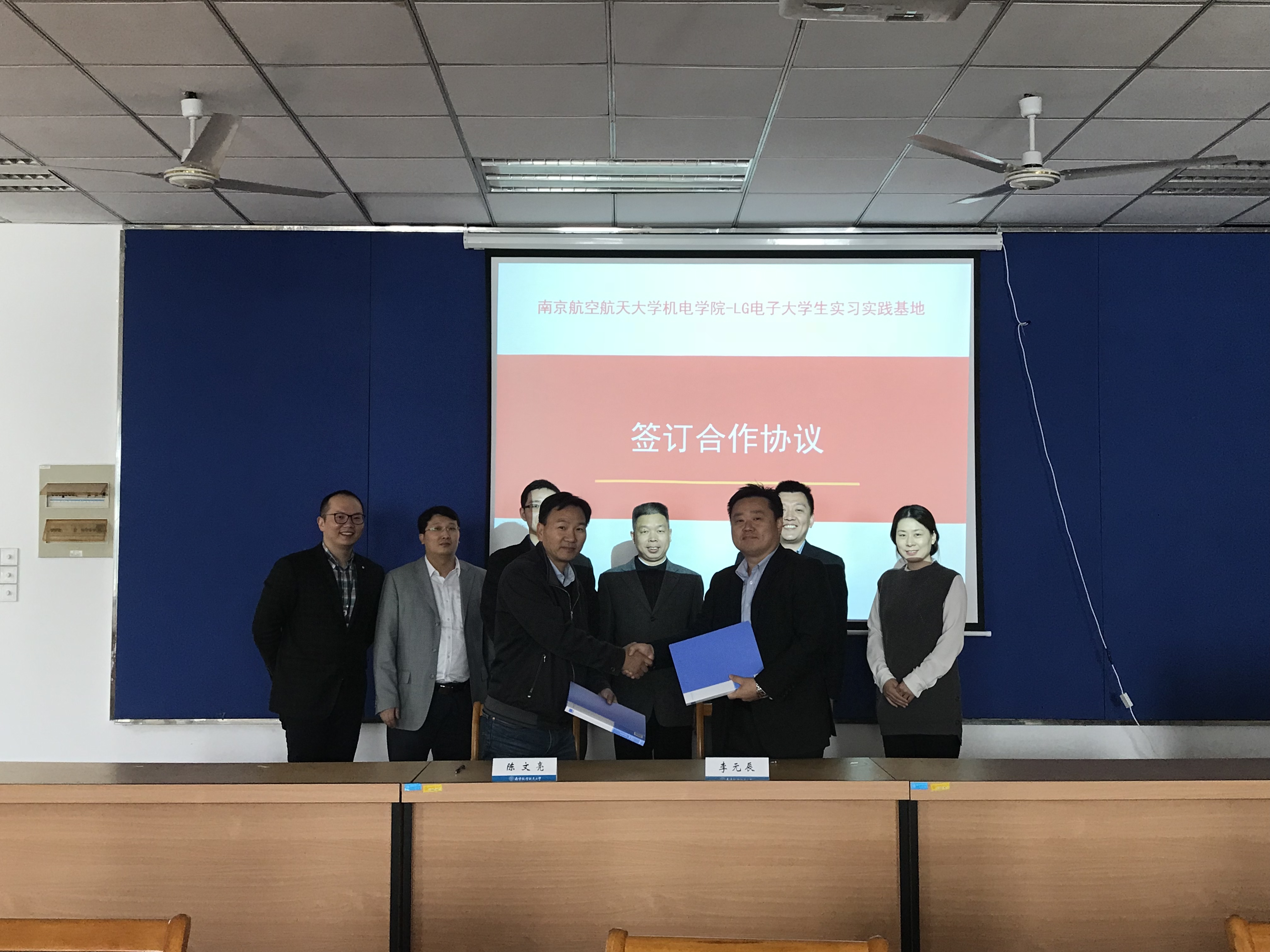 陈文亮、李元辰分别代表南航污污漫画 、LG电子签订了关于建立大学生实习实践就业基地的合作协议,并共同为实习基地揭牌。