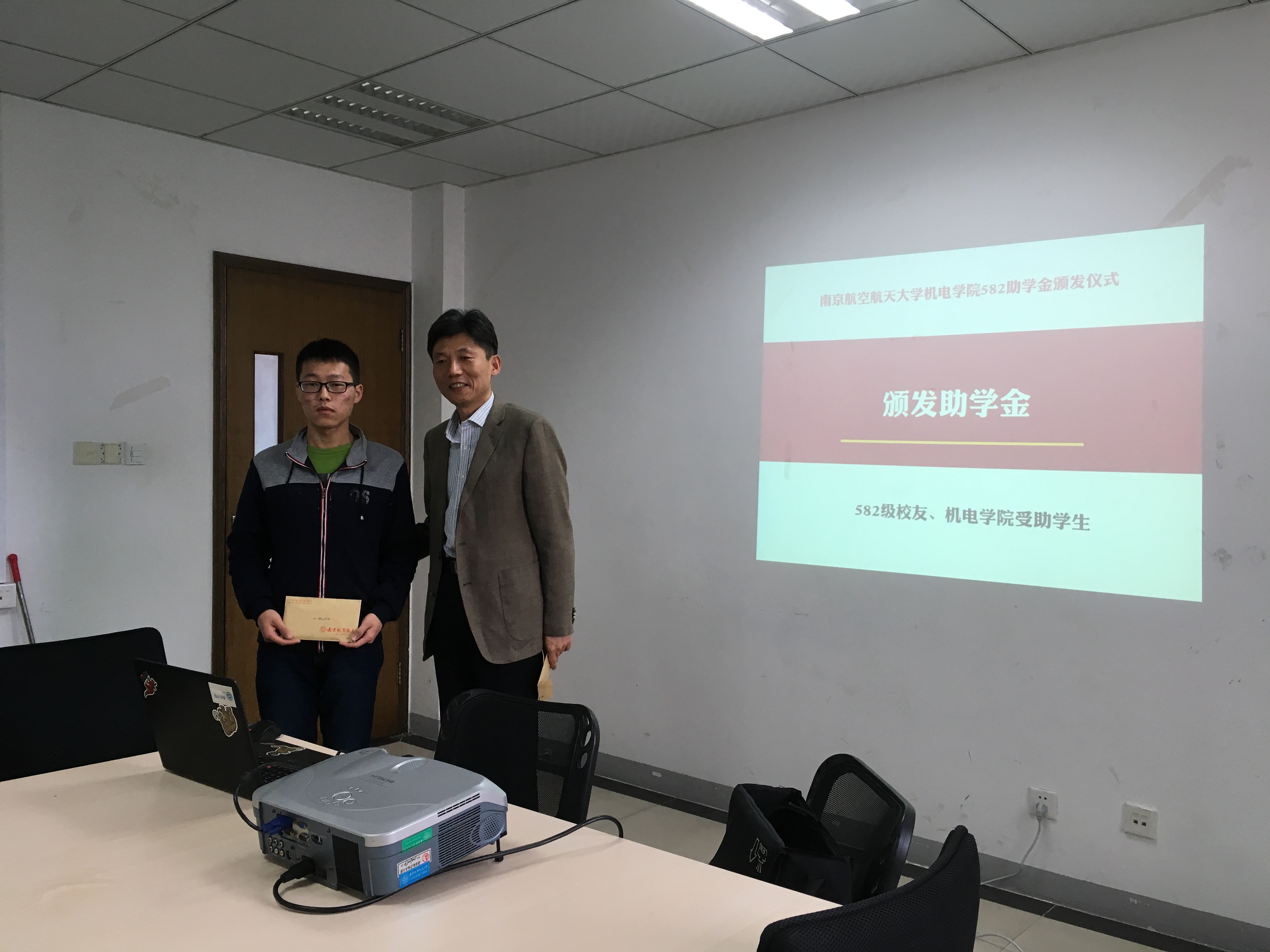 582助学金颁发仪式在我校将军路校区学工楼210会议室成功举行。582级校友代表陈文亮、王健出席了本次颁发仪式。仪式由学院党委副书记徐俊珠主持。