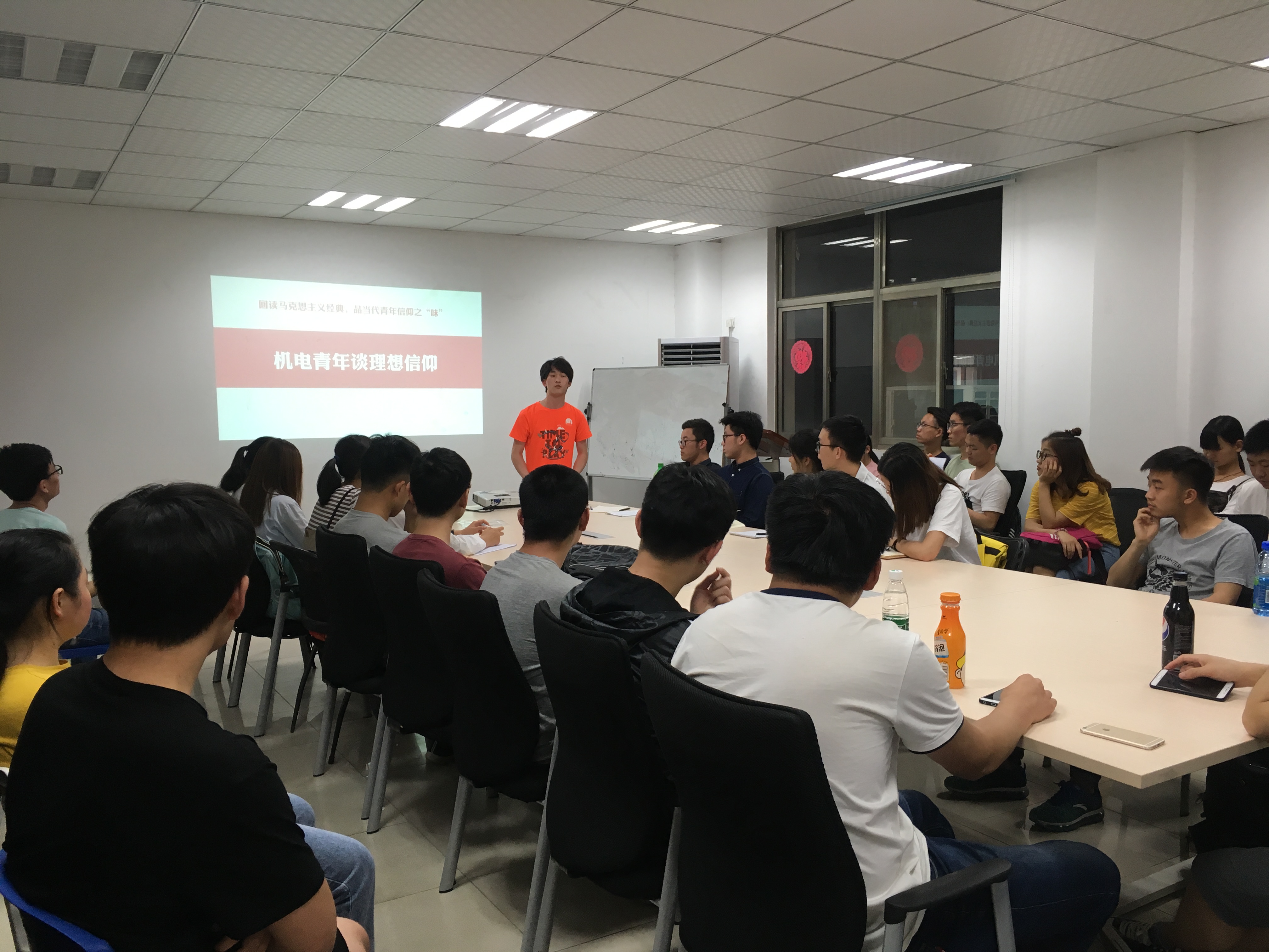 线下主题教育活动依托“机电青年信仰课堂”系列主题教育活动,以“回读马克思主义经典,品当代青年信仰之味”为主题,面向2016级、2017级团学干部进行理论学习和分享交流。本次主题分享交流会于2018年5月4日晚八点半在将军路校区学工楼210会议室举行,污污漫画 2016级辅导员康怡宁、2017级辅导员刘洪达以及两个年级的学生团干部参与了本次活动。