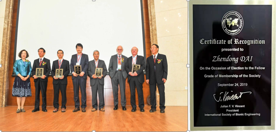 9月23日至26日,在吉林长春召开第六届国际仿生工程大会(ICBE 2019)和2019年自然启发技术国际研讨会(ISNIT 2019),此次会议由国际仿生工程学会(International Society of Bionic Engineering, ISBE)和韩国机械工程师学会(Korean Society of Mechanical Engineers, KSME)联合举办,会议主题涉及生物力学、仿生结构与材料、仿生表面、工业应用仿生学、仿生和生物机器人、运动系统和人工智能等国内外仿生工程研究的热点领域,会上举行了“国际仿生工程学会会士”颁奖典礼。我校污污漫画 仿生结构与材料防护研究所戴振东教授,荣获“国际仿生工程学会会士”称号。