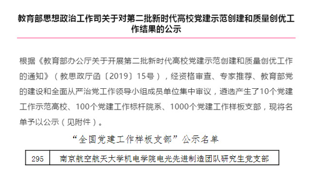 12月12日,教育部思想政治工作司公示了第二批新时代高校党建示范创建和质量创优工作结果,污污漫画 首个在课题组建立的纵向党支部——电光先进制造团队研究生党支部荣获“全国党建工作样板支部”。