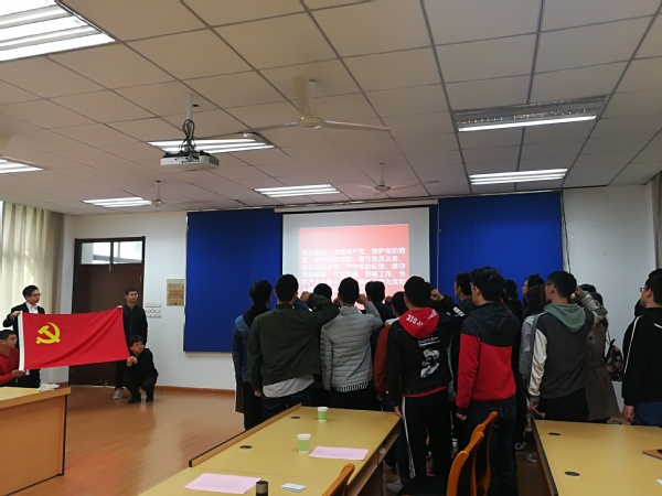 活动最后,在张凯的带领下,2018年下半年新发展的党员面向党旗庄严宣誓,丁秀东为每一位新党员佩戴党员党徽,勉励他们坚定理想信念,矢志爱国奋斗,早日成为一名合格的共产党员。鲜红的党旗,佩戴的党徽,既是一份信任与荣光,更是一份责任与担当。
