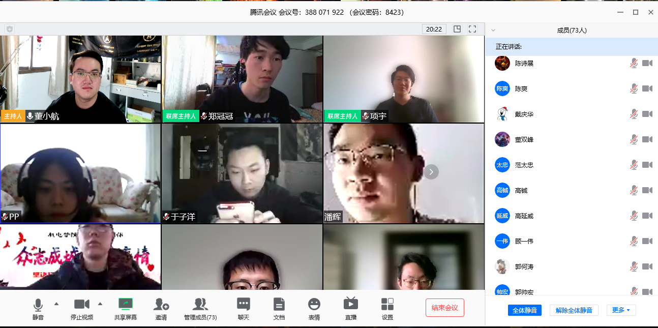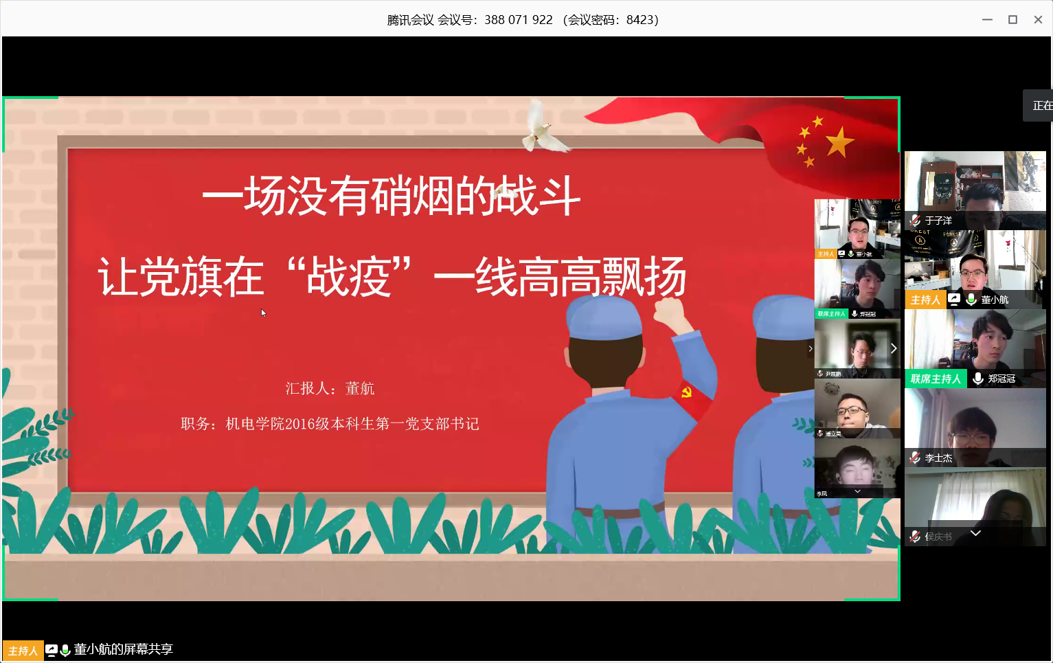 为了按时召开党支部大会,污污漫画 2016级本科生第一、第二党支部联合召开线上党支部大会,特殊时期,特殊办法,我也算是切身体会到了这个观念,党支部76名学生党员加上1名辅导员党支部书记,使得本次会议如火如荼的展开。反观会议内容,第一、第二党支部副书记分别分享了自己在防疫期间的心得感想,党支部书记紧接着给我们上了一堂特殊时期的党课,我个人觉得党支部会议就是让每一位党员的警钟长鸣,提醒每一位党员在不同时期都要牢记自己党员的身份,疫情期间,“党员先行”“党员打头阵”等等话语并不是停留在口号上的,我们学生党员同样是伟大党组织中的一份子,更是党组织中的新鲜血液,做好本职,做好带头,做出榜样,做合格党员!