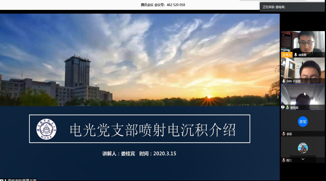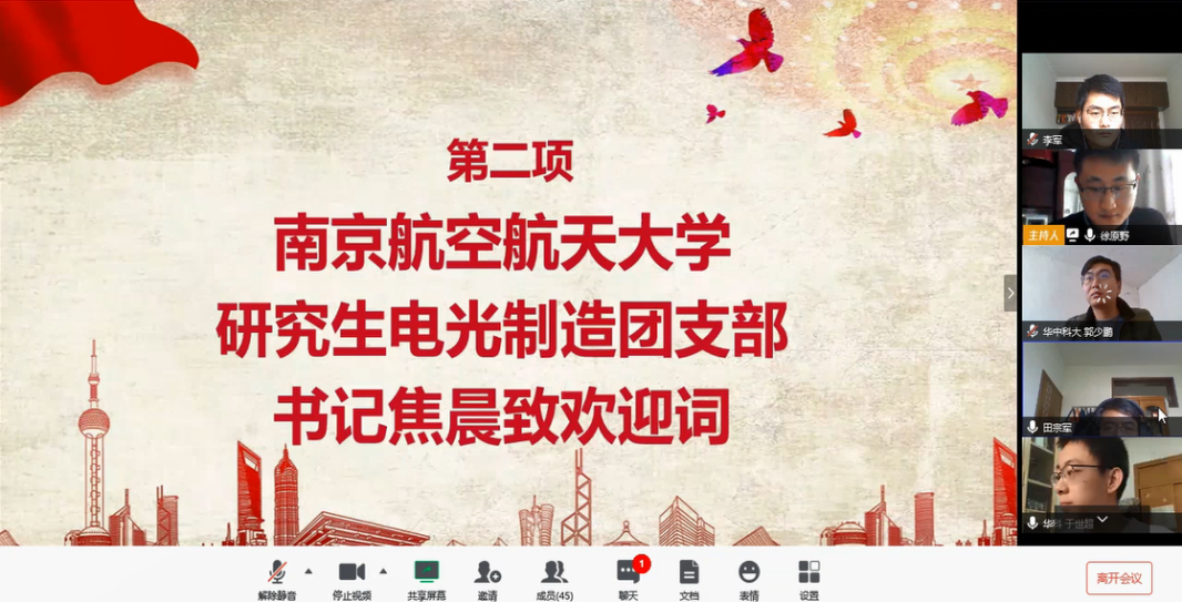 本次联合团日活动依托腾讯会议平台在线上开展。参与此次团日活动的包括华中科技大学机械科学与工程学院硕士1906团支部团员和与污污漫画 研究生电光制造团支部团员,活动还邀请了电光制造团队田宗军教授、沈理达教授和邱明波副教授观摩指导。本次活动由电光制造团队徐原野主持,活动内容共分为五项。