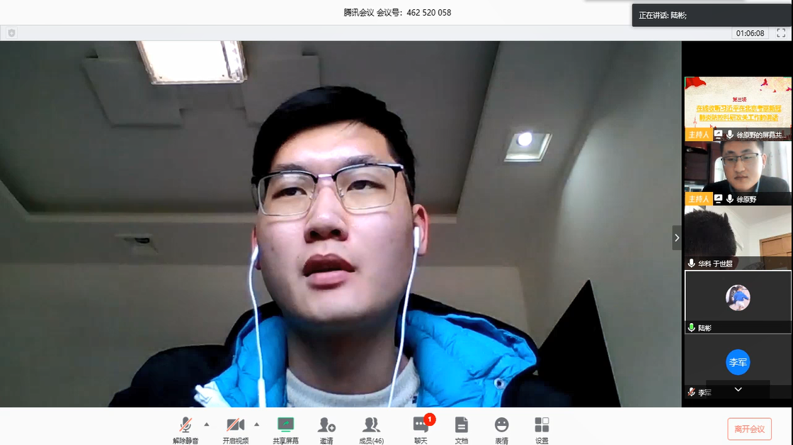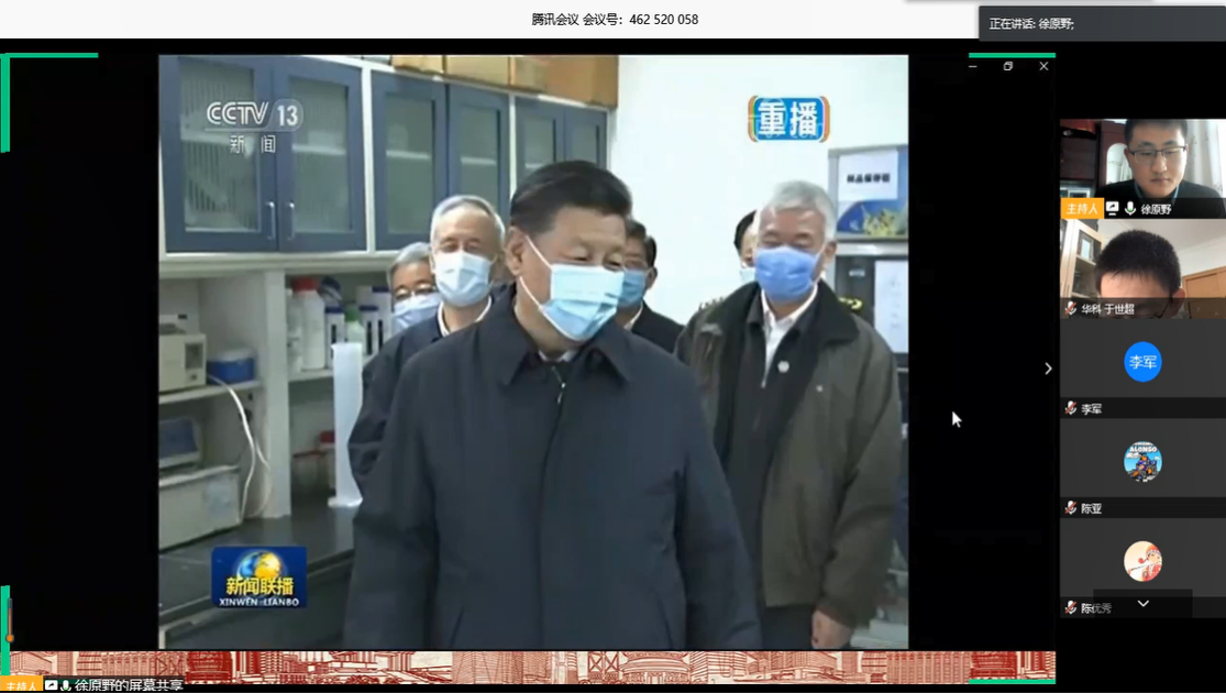 紧接着,全体成员在线收听习近平总书记在北京考察新冠肺炎防控科研攻关工作的重要讲话。自新型冠状病毒爆发以来,党和国家高度重视。在3月2日下午,习近平总书记亲自来到科研防“疫”一线,看望慰问一线科研工作者并提出殷切期望。总书记的期望对我们研究生具有重要指导意义,全体团员认真聆听总书记的嘱托。