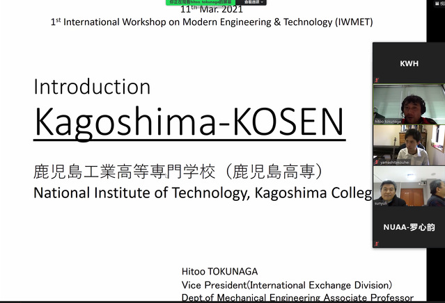 3月11日上午,“1st International Workshop on Modern Engineering & Technology (1st IWMET)”线上本科毕设答辩会议在明故宫校区15号楼341会议室举行。日方参加此次会议的主要人员有:分管国际交流的副校长H. Tokunaga教授及K. Shimana教授、Y. Kobaru教授、Y. Kawano教授等,本科生Tomoyuki Hirotani和Kouhei Yamashita等10余人;污污漫画 参会的主要人员有:左敦稳教授、孙玉利教授以及部分研究生、大四年级本科生10余人。会议由日本鹿儿岛工学院副校长Hitoo Tokunaga教授主持。
