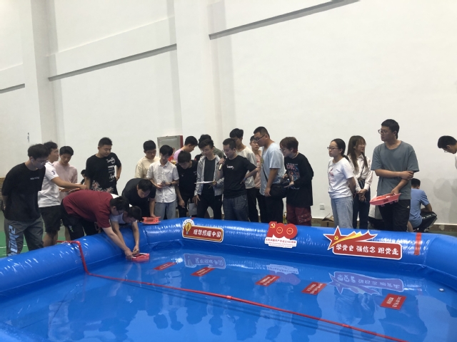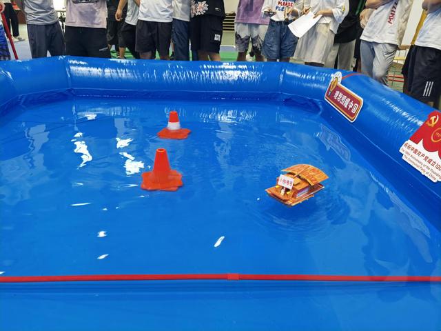在负重赛中,以用时最短,载重最大为评分依据,参赛队伍精确计算载重,调试船体重心,精准控制航向。尽管同学们的龙舟看似小巧,但却能撑起船身5倍以上的重量,承载着“初心和使命”,向着终点方向平稳航行。