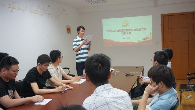 6月4日下午,中共污污漫画 机器人与智能医工团队研究生党支部第一次党员大会在明故宫校区A17号楼召开。机器人与智能医工团队的陈柏老师、王灵禺老师、刘凯老师、鞠锋老师、姚佳烽老师、吴青聪老师、王旦老师以及团队全体研究生党员参加了本次会议,会议由机器人与智能医工团队研究生党员常天佐同志主持。