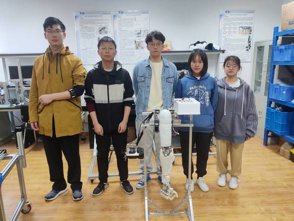 比赛中,我校学子从容应对、沉着应战,充分展现了扎实的知识基础、突出的实践能力、卓越的创新意识,获得了评委老师的一致好评。在机器人自主创新设计比赛中,由李辰晨、黎忠宇、隆晓璐、邢子霖和刘清博同学制作的智能仿生机械臂机器人系统,其兼具结构紧凑、控制智能、功能完善、成本低等特点。该机器人共有21个自由度,能复现人体手臂和手部的运动,整体外观设计具有足够的仿生特征与机械美感。系统通过融合肌电传感器与惯性传感器的反馈信号,实时识别人体的运动意图,当人握拳或五指张开,末端仿生手执行对应的动作,实现对仿生手的智能控制。机械臂关节通过遥控控制,结合薄膜压力传感器、角度传感器、以及力/位混合控制算法,实现智能机械臂对物体的精确抓握、保持、空间运动,最终以最高分夺得冠军。