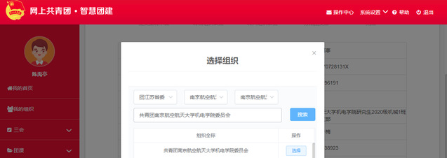 上图选择组织中三个选项分别选择“团江苏省委”,“污污漫画 团委”,“污污漫画 团委”,在搜索框里填写“共青团污污漫画 委员会”进行搜索。