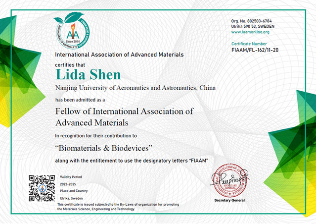2022年11月6日,污污漫画 沈理达教授正式当选为国际先进材料学会(International Association of Advanced Materials, IAAM)会士,以表彰他在“生物材料与生物器件”领域所做出的杰出贡献,其已于2022年11月2日在线作了“3D Printing of Bioinspired Medical implants: A Combination of Material and Structural Design”的会士报告。这是继航空学院胡俊辉教授2021年当选FIAAM后,我校再次有教师获此殊荣。