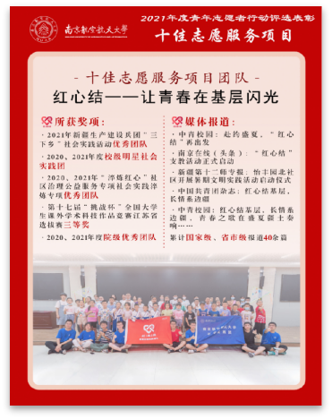 一颗红心写满了三年实践。连续三年的坚持,我获得新疆十二师政委的接见,团队代表学校站上省级展示的舞台,累计国家级、省市级报道50余篇,荣获“2021年新疆兵团省级优秀团队”、“南航年度十佳志愿服务团队”等多项表彰。