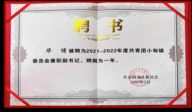 在校外,我积极响应国家号召,受聘担任家乡寿县兼职团委副书记,将新时代大学生风貌带回家乡。