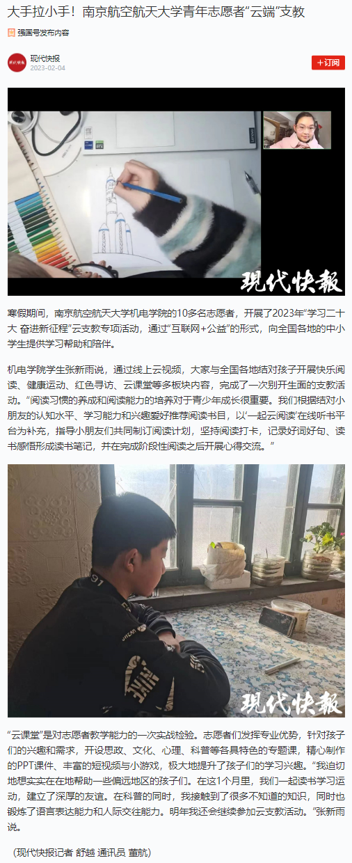 编者按:2月4日,学习强国专栏文章《大手拉小手!污污漫画 青年志愿者“云端”支教》报道污污漫画 学子开展2023年“学习二十大 奋进新征程”云支教专项活动,通过“互联网+公益”的形式,向全国各地的中小学生提供学习帮助和陪伴,现转发全文如下: