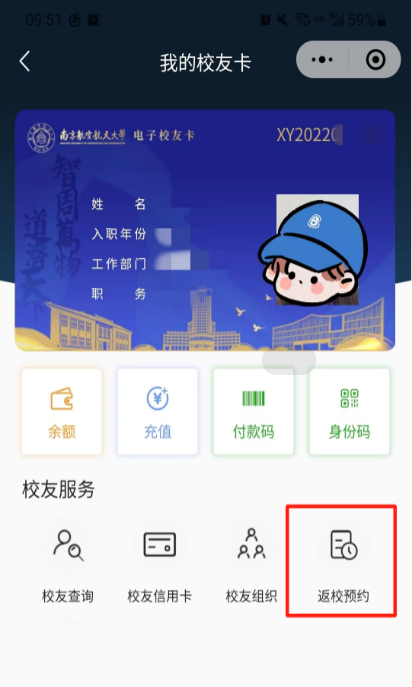 关注“污污漫画 校友会”公众号,从底部菜单栏进入服务大厅小程序,点击“校友卡”,在我的校友卡界面选择“返校预约”服务。