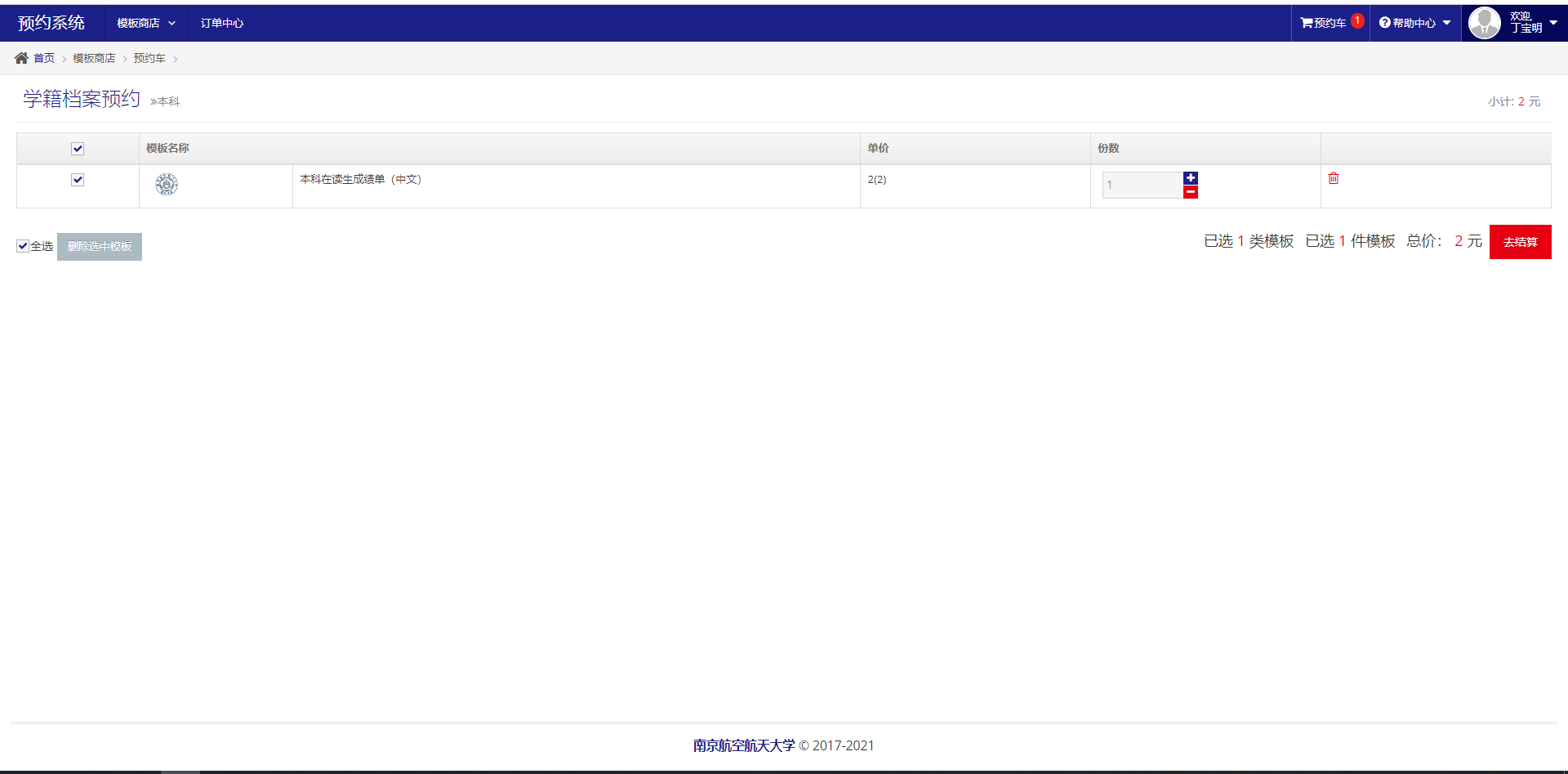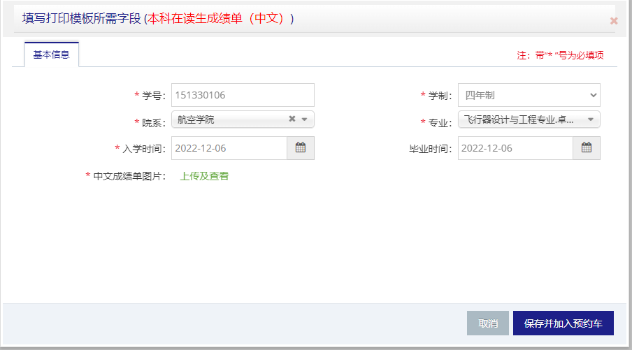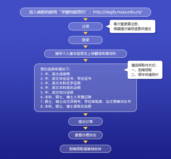 学籍档案预约:用户用于订购自己的需要的模板,成绩单、在学证明、毕业证明等等。