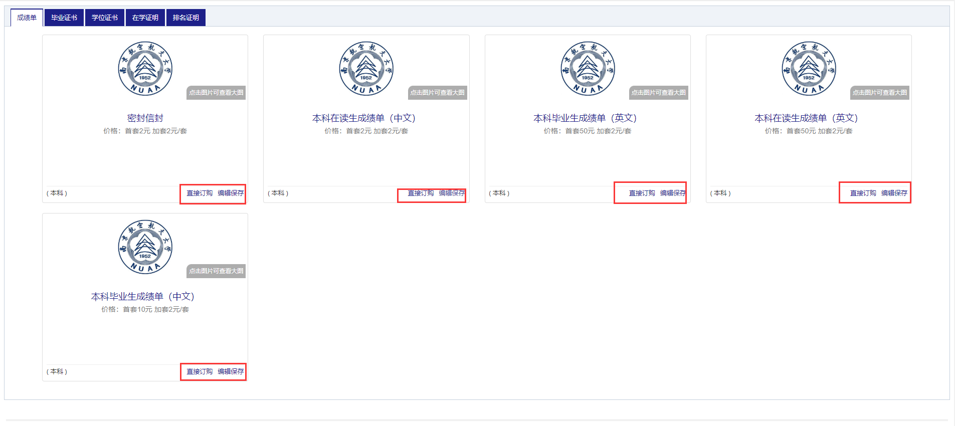直接订购:此按钮主要针对于模板中没有需要填写的学位信息,如果有需要填写学位信息,用户仍可以继续订购,但会在最后的结算页面重新提醒用户填写模板的学位信息。