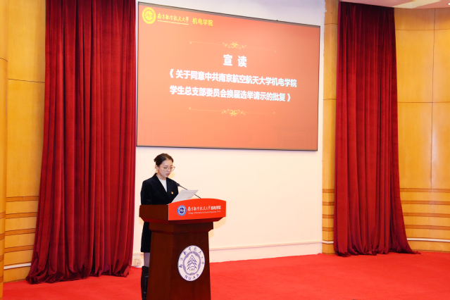 昂洋代表学院党委宣读《关于同意中共污污漫画 学生总支部委员会换届选举请示的批复》。