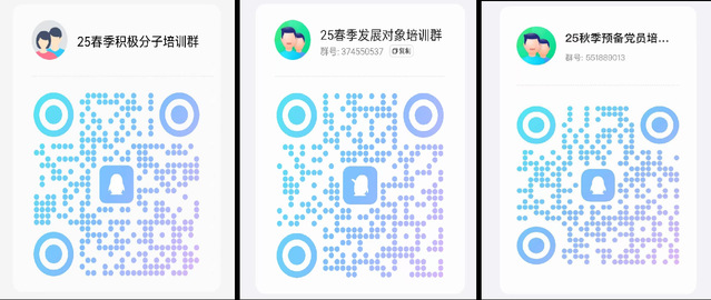 (三)请参加本期入党积极分子、发展对象、预备党员培训的同学于4月20日前加入对应的QQ群,后续通知将在QQ群发布,逾期未加入的同学视作放弃参加培训资格。