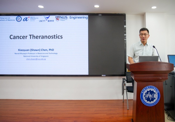 陈小元院士,新加坡国家科学院院士、欧洲科学院院士、欧盟科学院院士,现任新加坡国立大学杨潞龄医学院/工程学院双聘终身讲席教授,新加坡国立大学纳米医学转化研究部主任及医学院临床影像研究中心主任,主要从事创新诊疗药物的研发及临床转化工作。癌症诊疗一体化是近年来精准医学领域的重要发展方向,其核心在于整合诊断与治疗功能,实现“诊-疗协同”的个性化医疗模式,显著提升了肿瘤治疗的靶向性与可控性。诊疗一体化技术已在前列腺癌、乳腺癌等实体肿瘤中展现出显著优势,为肿瘤精准治疗提供了新的范式。陈院士在报告中首先为同学们介绍了治疗诊断学中的开发分子诊断与靶向治疗;随后分别从核素诊疗及纳米诊疗两方面入手,用幽默风趣的语言就肿瘤治疗诊断与治疗这一问题难点进行深度剖析,最后介绍了癌症诊疗领域较为前沿的发展与突破。